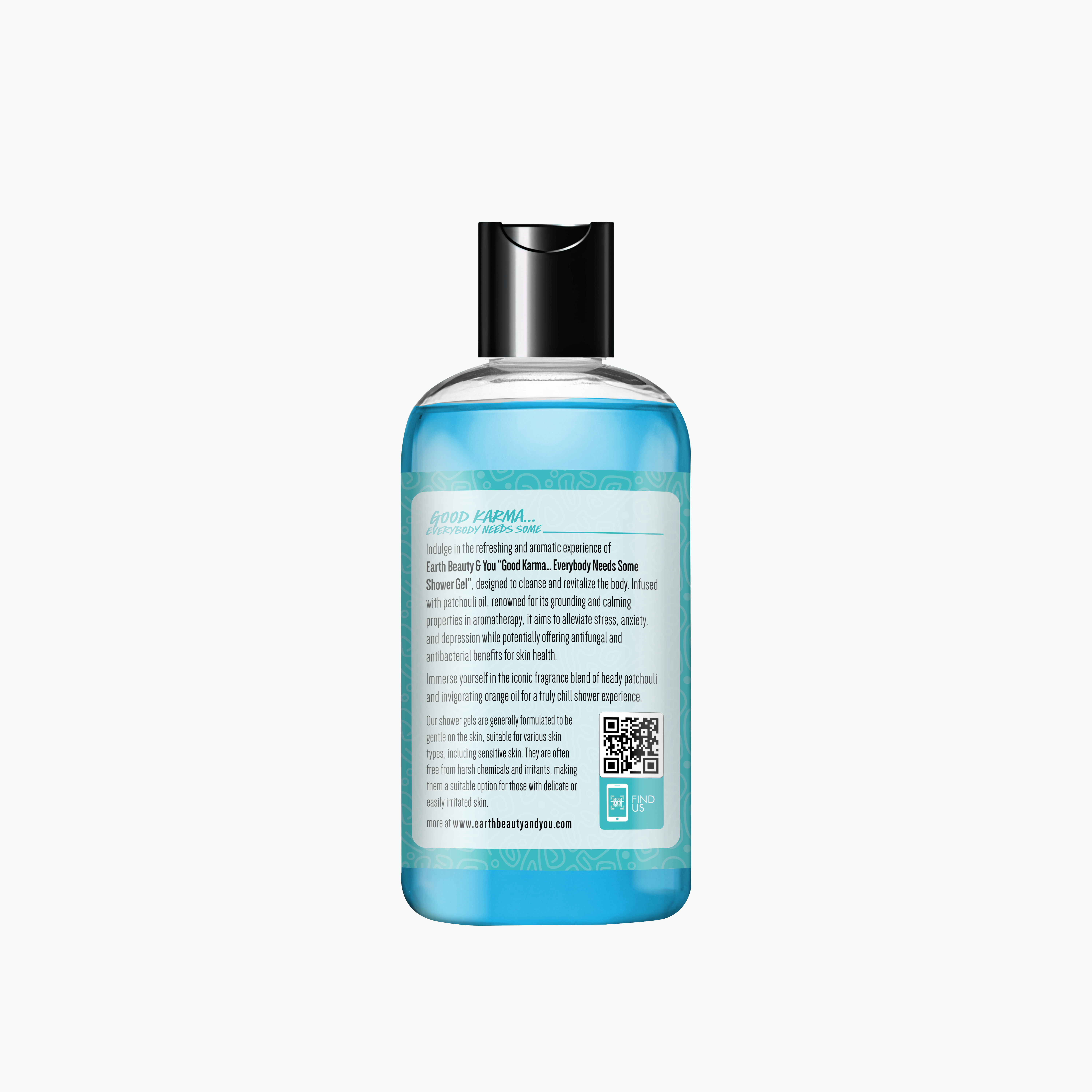 Earth Beauty & You “Good Karma… Everybody Needs Some Shower Gel”, designed to cleanse and revitalize the body. Infused with patchouli oil, renowned for its grounding and calming properties in aromatherapy, it aims to alleviate stress, anxiety, and depression while potentially offering antifungal and antibacterial benefits for skin health.